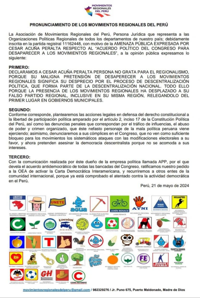 «Declaramos a César Acuña Peralta persona non grata para el regionalismo, porque su maligna pretensión de desaparecer a los movimientos regionales significa su desprecio por el proceso de descentralización política, que forma parte de la descentralización nacional», se detalla.