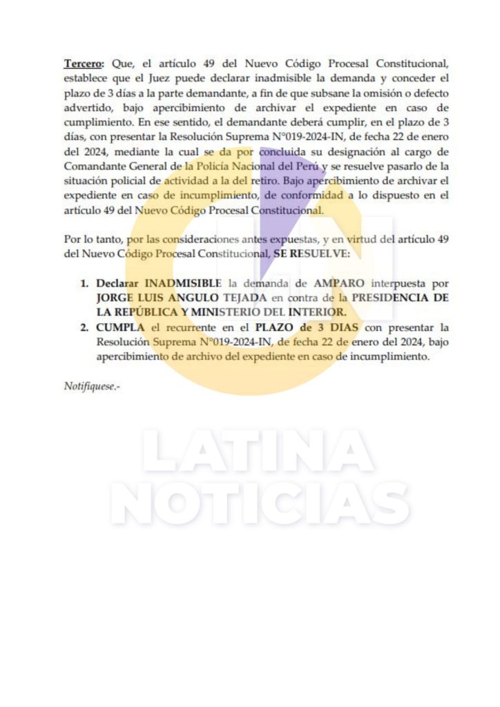 Como se lee en el documento al que accedió Latina Noticias, se declaró inadmisible la demanda de amparo y se resolvió también que se “cumpla el recurrente en el plazo de tres días con presentar la Resolución Suprema N°019-2024-IN, de fecha 22 de enero del 2024, bajo apercibimiento de archivo del expediente en caso de incumplimiento”.