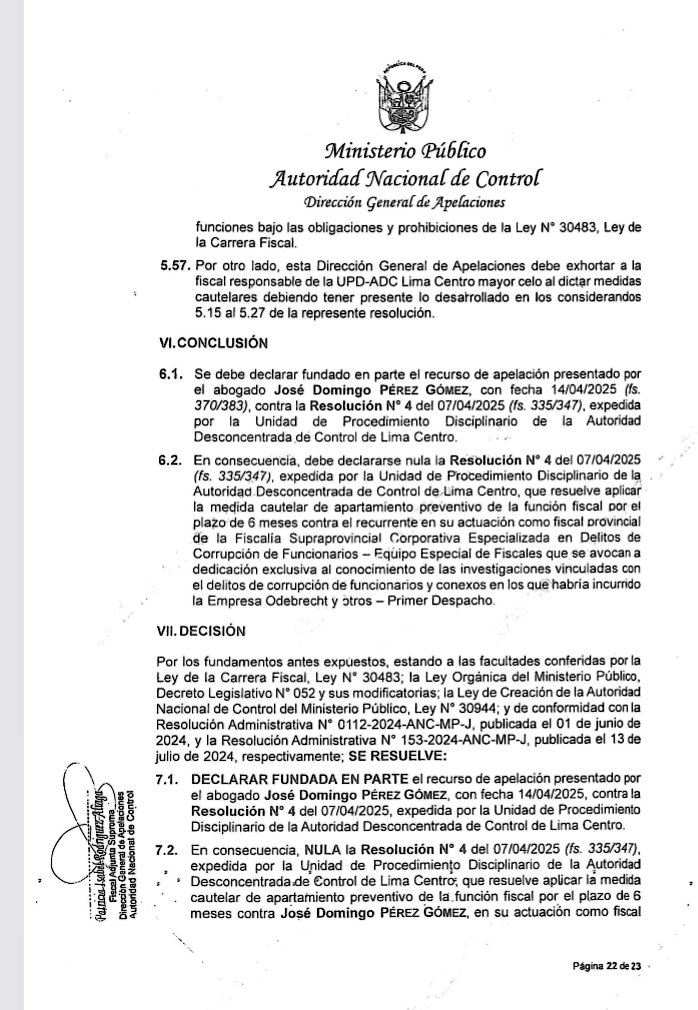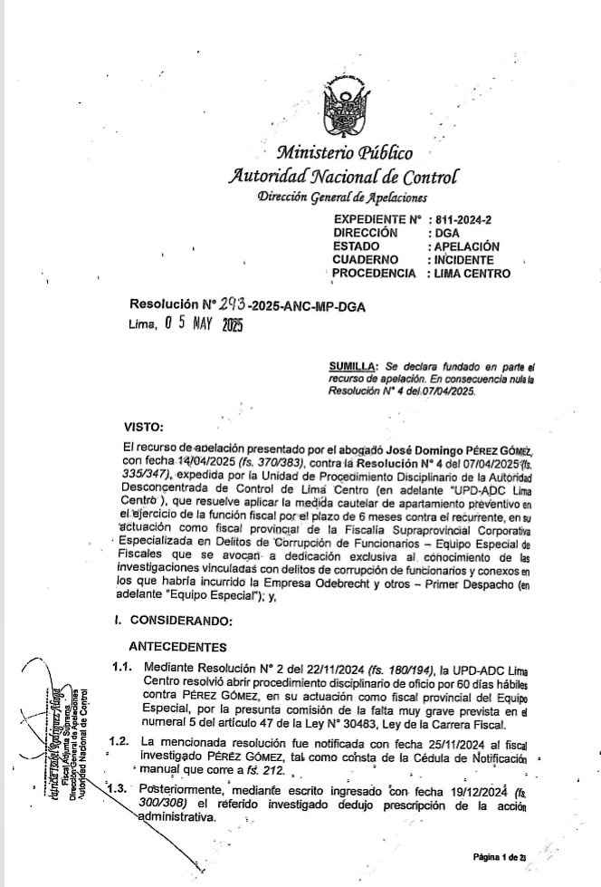 Según la resolución de la ANC, se declaró fundado en parte el recurso de apelación que presentó José Domingo Pérez. En ese sentido, se declaró nulo su apartamiento preventivo del cargo, por seis meses, por lo que deberá retornar a sus labores en el Equipo Especial Lava Jato a partir del martes 6 de mayo.
