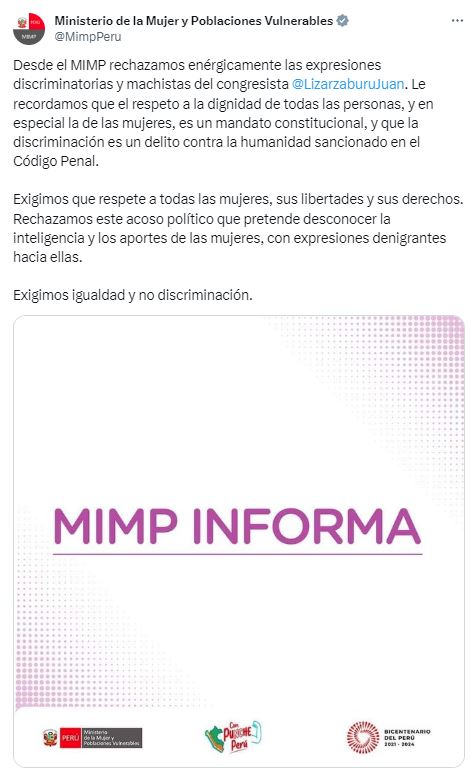 “Desde el MIMP rechazamos enérgicamente las expresiones discriminatorias y machistas del congresista @LizarzaburuJuan. Le recordamos que el respeto a la dignidad de todas las personas, y en especial la de las mujeres, es un mandato constitucional, y que la discriminación es un delito contra la humanidad sancionado en el Código Penal.