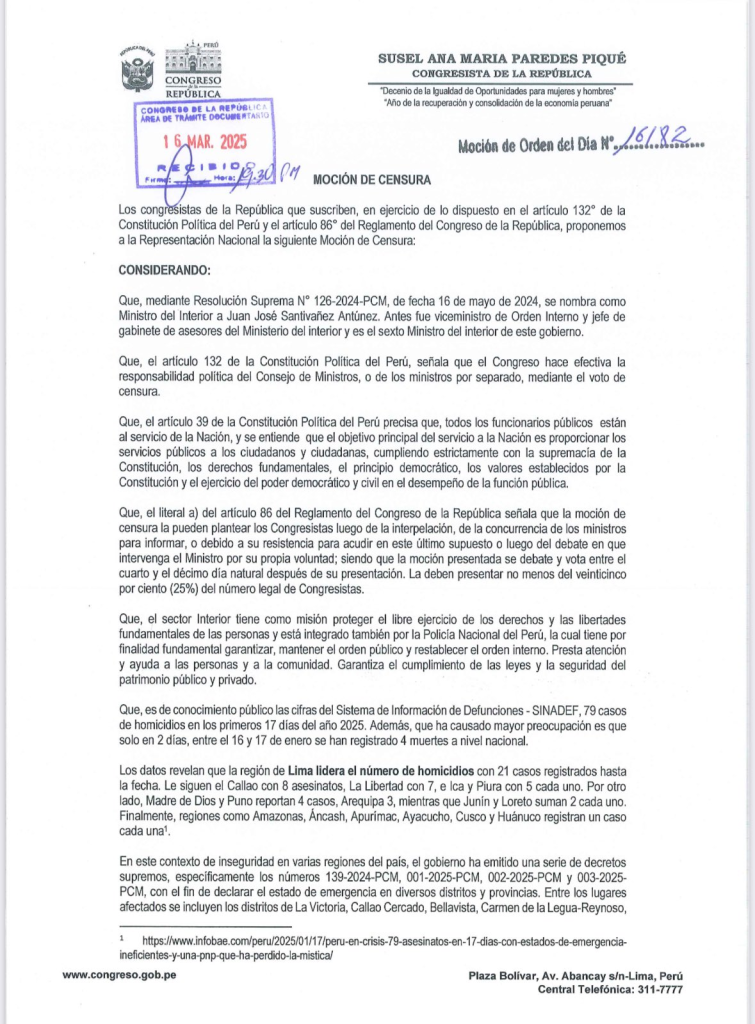 Congresistas de la República han presentado una moción de censura contra el ministro del Interior, Juan José Santiváñez, cuestionando su gestión frente a la crisis de inseguridad que atraviesa el país. La medida cuenta con el respaldo de las bancadas de Fuerza Popular, Renovación Popular y Avanza País, quienes argumentan que las acciones tomadas hasta ahora han sido insuficientes para frenar el avance de la delincuencia.
