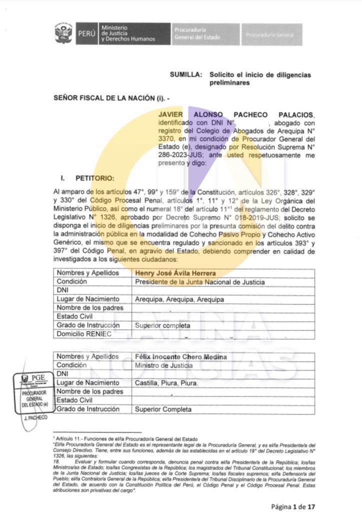 El Ministerio de Justicia y Derechos Humanos, a través de la Procuraduría General del Estado (PGE), solicitó al fiscal de la Nación, Juan Carlos Villena, el inicio de diligencias preliminares por la presunta comisión del delito contra la administración pública contra José Ávila Herrera, Félix Inocente Chero Medina, esto tras las declaraciones de Jaime Villanueva Barreto.