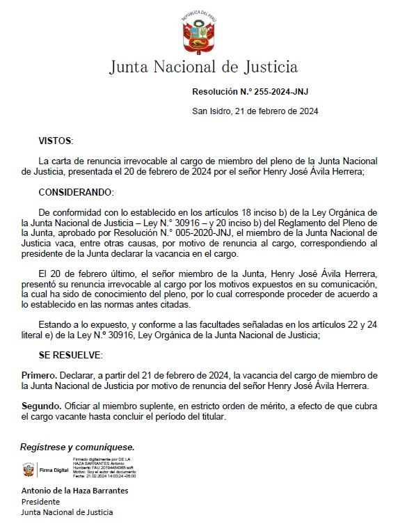 La resolución, que aparece este jueves en el diario oficial El Peruano, tiene la firma del presidente de la JNJ, Antonio de la Haza. Además, se da cuenta que se oficie al accesitario de Ávila que sería el abogado Abraham Siles para que asuma su cargo a la brevedad posible.