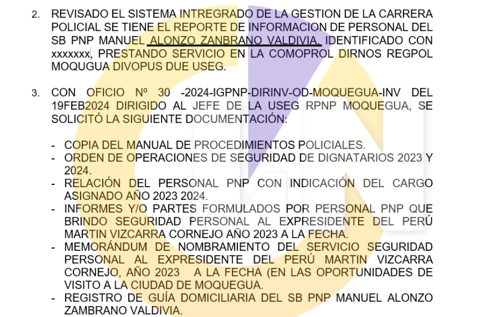- Un memorándum sobre el nombramiento del servicio de seguridad personal a Vizcarra en las oportunidades que visitó Moquegua entre el 2023 y este año.