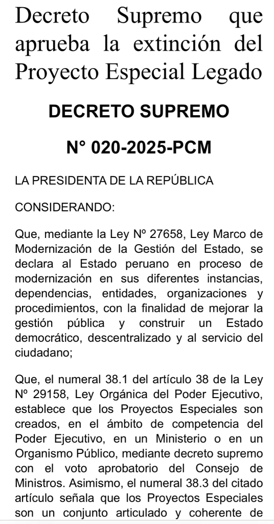 De acuerdo a lo anunciado en la reciente sesión del Consejo de Ministro, el Proyecto Especial Legado no va más. Su extinción se confirmó con el Decreto Supremo N.° 020-2025-PCM publicado este jueves 13 de febrero, el cual cuenta con las firmas de la presidenta de la República, Dina Boluarte, y los ministros Walter Astudillo y Morgan Quero.