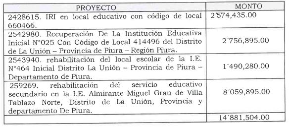 Por otra parte, también se detallan 57’359.738,02 (más de 57 millones de soles) en obras destinadas al distrito de la Unión en Piura por los siguientes conceptos: