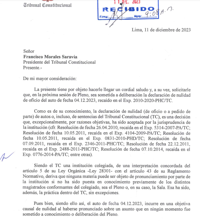 “El auto de fecha 04.12.2023 incurre en una objetiva causal de nulidad al haberse pronunciado sobre un asunto que en ningún momento fue sometido a conocimiento o deliberación del Pleno”, se lee en el documento enviado a Morales.