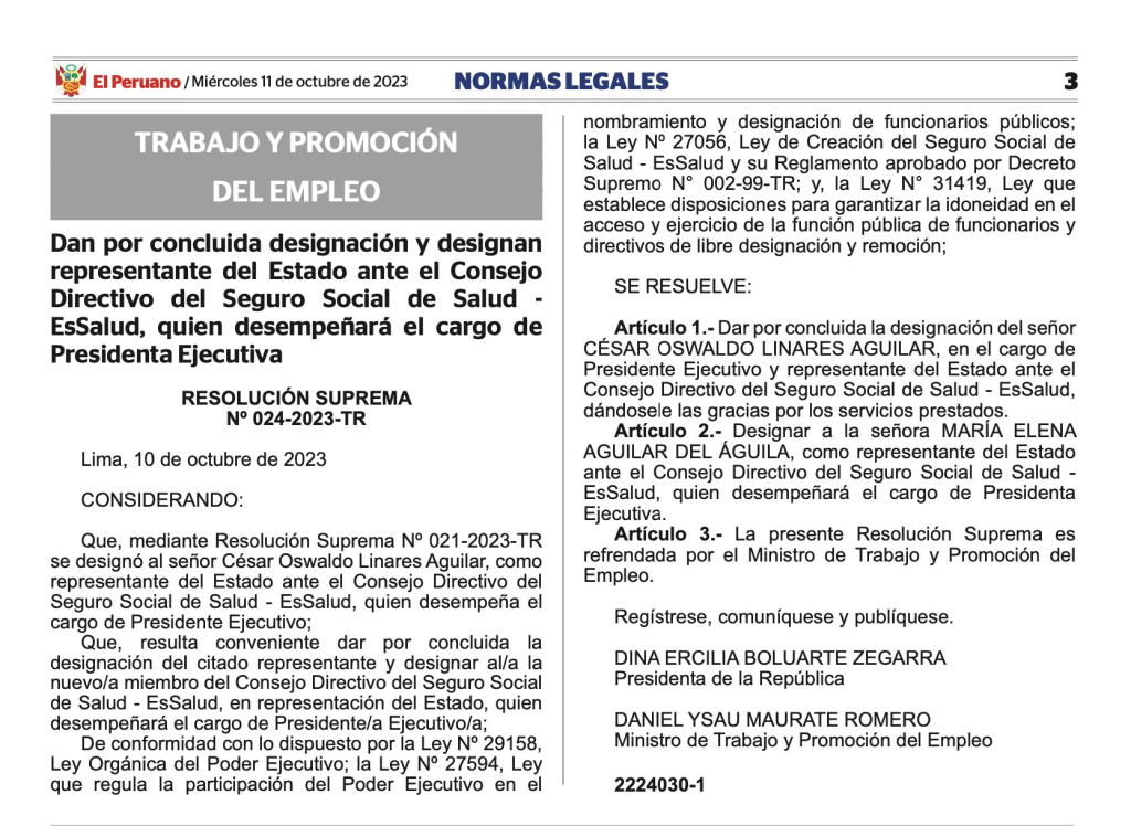 “Designar a la señora María Elena Aguilar del Águila como representante del Estado ante el Consejo Directivo del Seguro Social de Salud EsSalud, quien desempeñará el cargo de Presidenta Ejecutiva”, se lee en el documento.