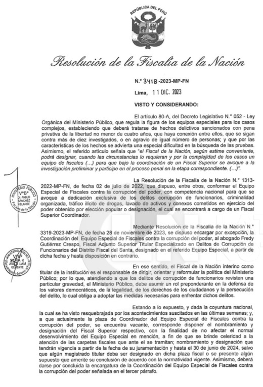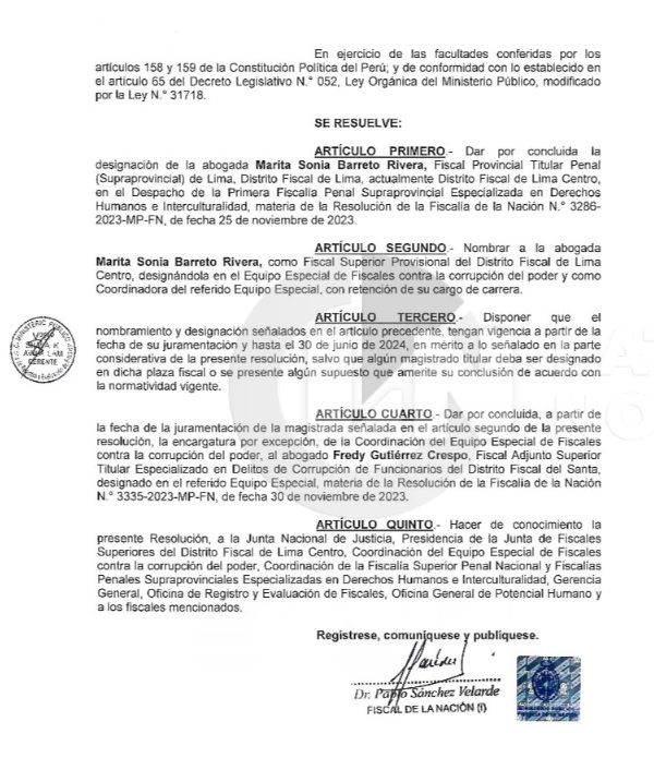 Asimismo, se da por concluida la designación del abogado Fredy Gutiérrez Crespo para este cargo a partir de la fecha de juramentación de la fiscal. Barreto encabezó el mencionado grupo de trabajo de la Fiscalía hasta que Benavides decidió destituirla tras revelarse que tenía una investigación en su contra.