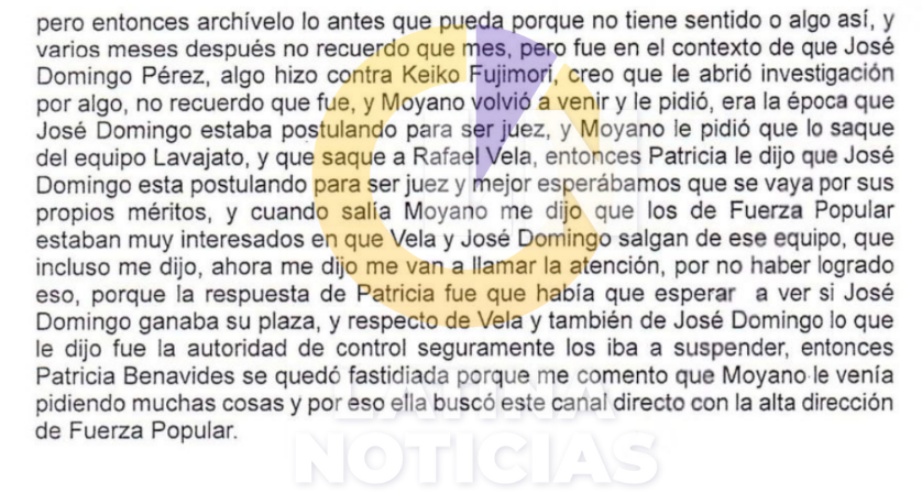 “Moyano le pidió que lo saque del equipo Lava Jato, y que saque a Rafael Vela. Entonces Patricia le dijo que José Domingo está postulando para ser juez y mejor esperábamos que se vaya por sus propios méritos. Y cuando salía Moyano me dijo que los de Fuerza Popular estaban muy interesados en que Vela y José Domingo salgan de ese equipo. Incluso (Moyano) me dijo: ‘Ahora me van a llamar la atención, por no haber logrado eso’. Porque la respuesta de Patricia fue que había que esperar a ver si José Domingo ganaba su plaza”, declaró ante la Fiscalía.