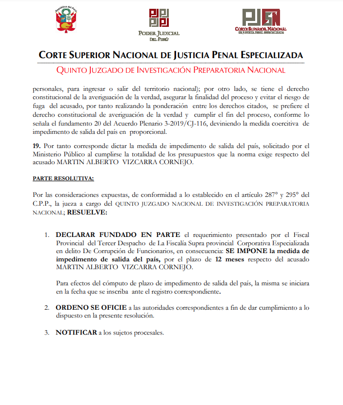“SE IMPONE la medida de impedimento de salida del país, por el plazo de 12 meses respecto del acusado MARTÍN ALBERTO VIZCARRA CORNEJO.”