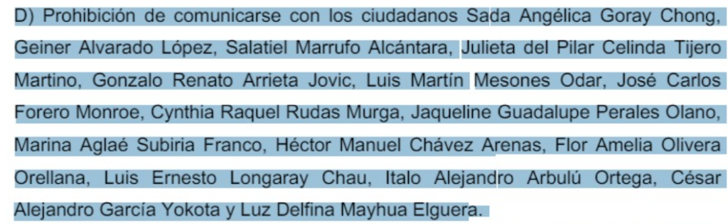 Entre las condiciones impuestas por el tribunal está la prohibición de comunicación con testigos y coimputados, es decir, se le ha prohibido estrictamente comunicarse con un listado específico de personas involucradas en la investigación. Entre ellas están: Sada Angélica Goray Chong, Geiner Alvarado López, Salatiel Marruto Alcántara, entre otros.