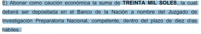 Por otro lado, otra de las condiciones es que Fernandini deberá abonar una caución económica de treinta mil soles, la cual debe ser depositada en el Banco de la Nación a nombre del Juzgado de Investigación Preparatoria Nacional, dentro de un plazo de diez días hábiles.