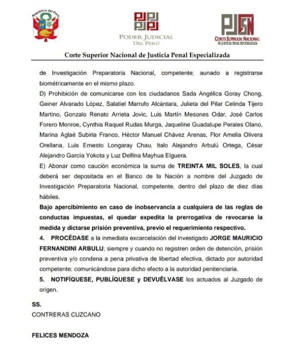 - Depósito de Caución Económica: Fernandini Arbulú deberá abonar una caución económica de treinta mil soles, la cual debe ser depositada en el Banco de la Nación a nombre del Juzgado de Investigación Preparatoria Nacional, dentro de un plazo de diez días hábiles.