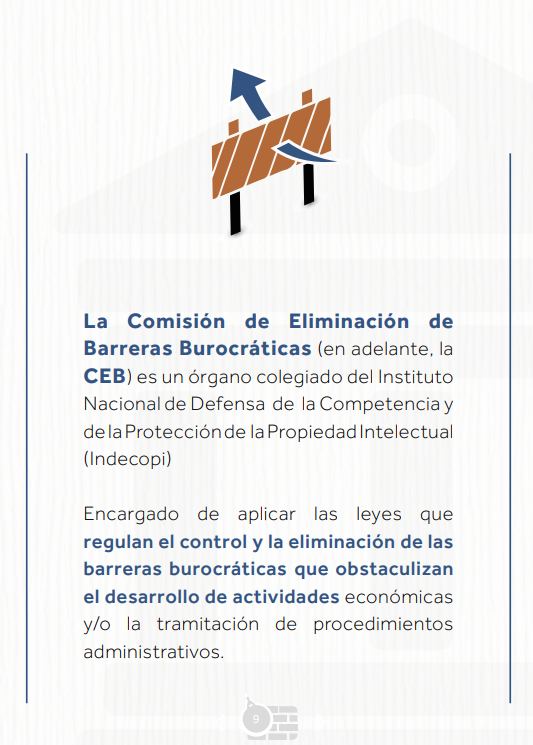 Según el Indecopi, las barreras burocráticas son los actos y disposiciones de las entidades del Estado que establecen exigencias, requisitos, limitaciones, prohibiciones o cobros para la realización de actividades económicas, que afectan las normas y los principios de simplificación administrativa o que limitan la competitividad en el mercado. De acuerdo con el Decreto Legislativo N.° 1256, se constituye una barrera burocrática toda exigencia, requisito, limitación, prohibición y/o cobro que imponga cualquier entidad, dirigido a condicionar, restringir u obstaculizar el acceso y/o permanencia de los agentes económicos (concesionarios, empresas). La Comisión de eliminación de barreras burocráticas es competente para conocer los actos administrativos, disposiciones administrativas y actuaciones materiales que impongan barreras burocráticas ilegales y/o carentes de razonabilidad.