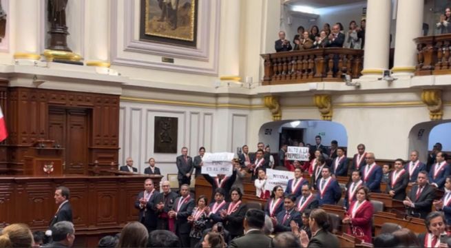 Sin embargo, al hacer su ingreso en el hemiciclo, algunos legisladores la recibieron con unas pancartas en las que se leía los siguientes mensajes: “Alto a la represión”, “Nueva Constitución” y “Justicia: Puno es el Perú”.