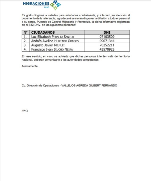 La emisión de esta alerta fue firmada por Gilbert Vallejo, director de Operaciones de Migraciones, y se hace en el marco de las medidas de prevención por posibles intentos de fuga. Según información del Ministerio Público, los implicados habrían estado involucrados en un esquema de tráfico de influencias. En particular, se acusa a Andrés Hurtado de haber facilitado pagos a la fiscal Peralta, quien presuntamente intervino para devolver una significativa cantidad de oro incautado.