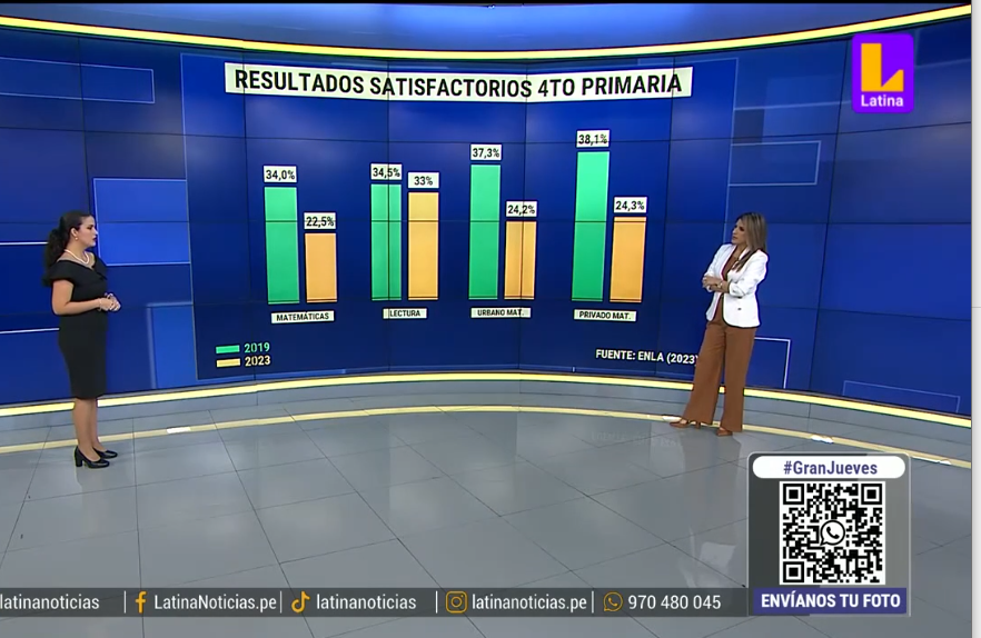 Según Paola Del Carpio, economista de la Red de Estudios para el Desarrollo (REDES), los resultados en matemáticas y lectura muestran un claro deterioro entre 2019 y 2023. “En matemáticas, a nivel nacional, solo el 22.5% de los estudiantes lograron un nivel satisfactorio en 2023, comparado con el 34% en 2019″, indicó en Latina Noticias Matinal.