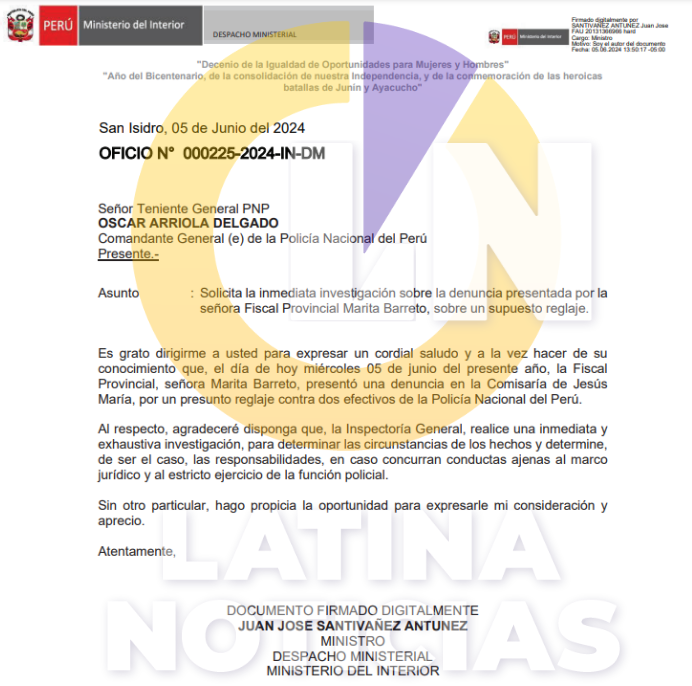 “Agradeceré disponga que, la Inspectoría General, realice una inmediata y exhaustiva investigación, para determinar las circunstancias de los hechos y determine, de ser el caso, las responsabilidades, en caso concurran conductas ajenas al marco jurídico y al estricto de la función policial”, se lee en el oficio enviado por el ministro Santiváñez al teniente general PNP Óscar Arriola, quien está a cargo de la comandancia general de manera interina.