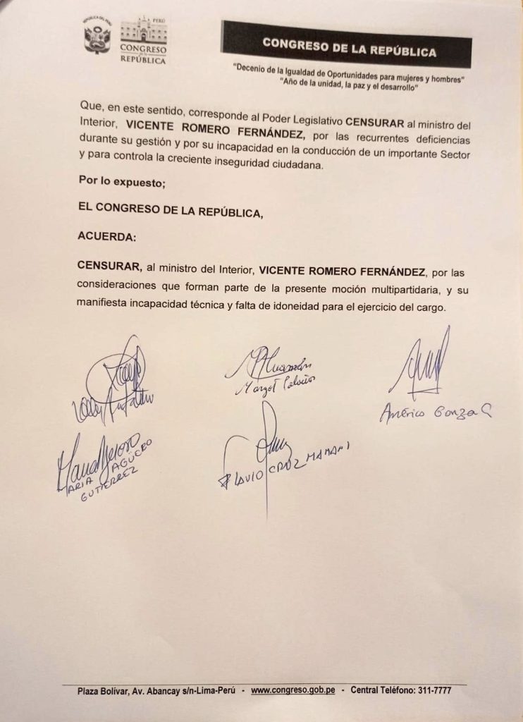 Además, desde la bancada de Perú Libre, también se han iniciado acciones relacionadas con la recolección de firmas para presentar una moción de censura contra el Ministro del Interior.