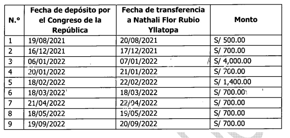 Por su parte, Abigail García Díaz, que era auxiliar en la Subcomisión de Acusaciones Constitucionales, hizo una transferencia por S/ 2000 al sobrino de Rosío Torres Salinas. En tanto, César Macedo Von Bancels y Estefanía Calvo Zuñiga hicieron transferencias por S/ 3 600 y S/ 5 000 entre diciembre del 2021 y noviembre del 2022, respectivamente.