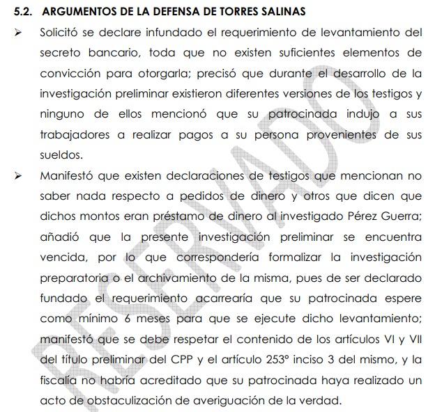 “Se declare infundado el requerimiento de levantamiento del secreto bancario, toda que no existen suficientes elementos de convicción para otorgarla; precisó que durante el desarrollo de la investigación preliminar existieron diferentes versiones de los testigos y ninguno de ellos mencionó que su patrocinada indujo a sus trabajadores a realizar pagos a su persona provenientes de sus sueldos”, se lee en el documento judicial.
