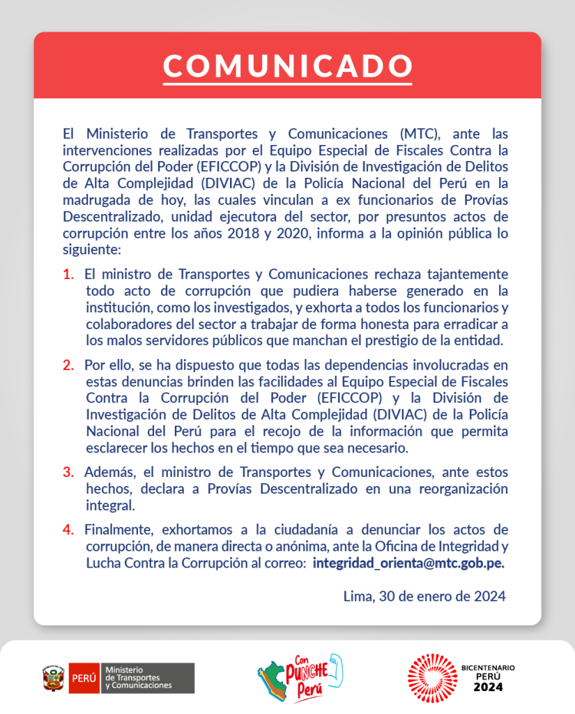“El ministro de Transportes y Comunicaciones rechaza tajantemente todo acto de corrupción que pudiera haberse generado en la institución, como los investigados, y exhorta a todos los funcionarios y colaboradores del sector a trabajar de forma honesta para erradicar a los malos servidores públicos que manchan el prestigio de la entidad”, se lee.