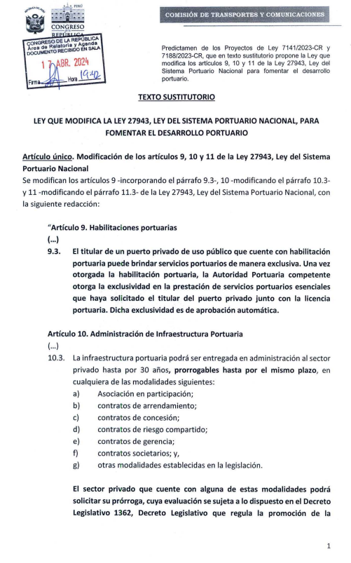Sin embargo, a inicios de este mes es que en el Pleno se apoyó una cuestión previa para que el artículo 10 de la nueva ley, donde se habla que la infraestructura portuaria podrá ser entregada en administración al sector privado hasta por 30 años, pero con la posibilidad de que dicho plazo se prorrogue otra vez por el mismo tiempo, vuelva a comisión para que se discuta mejor. Este miércoles 29 de mayo se debería votar una reconsideración a esta decisión.