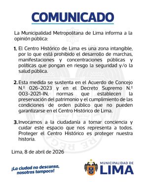 Según la comuna limense, la decisión se basa en el Acuerdo de Concejo N° 026-2023 y el Decreto Supremo N° 003-2021-IN, que establecen la prohibición de marchas, manifestaciones y concentraciones públicas y políticas que pongan en riesgo la seguridad o salud pública. El primero fue publicado por la gestión de Rafael López Aliaga en medio de protestas sociales.