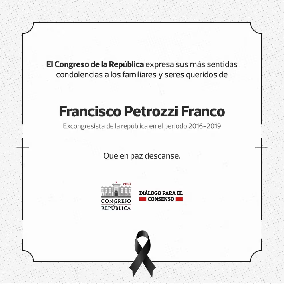 “El Congreso de la República expresa sus más sentidas condolencias a los familiares y seres queridos de Francisco Petrozzi Franco, excongresista de la República en el periodo 2016-2019; que en paz descanse”, se lee en el comunicado difundido en redes sociales.