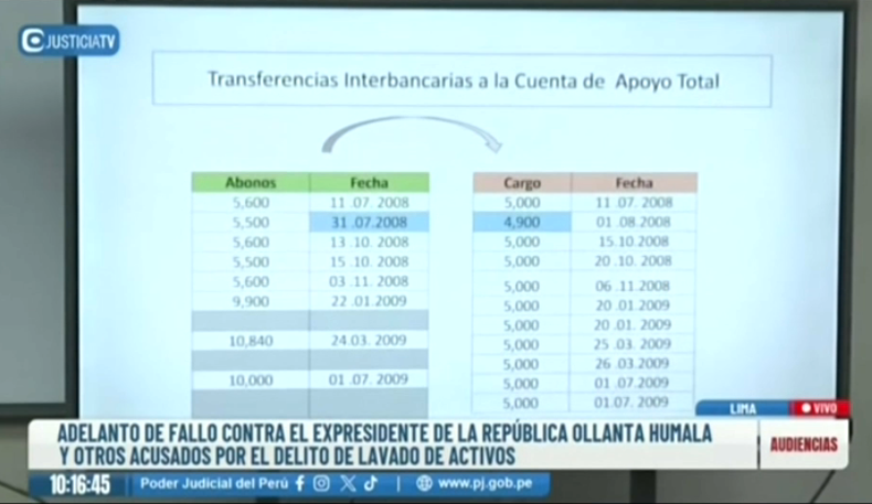 En esa línea, la magistrada mostró diapositivas donde se grafican las dinámicas del traspaso del dinero en la empresa Apoyo Total, en 2008 y 2009. “A nivel de la valoración, hay una pretensión de dar legitimidad a un dinero que no lo tenía”, resaltó la jueza.