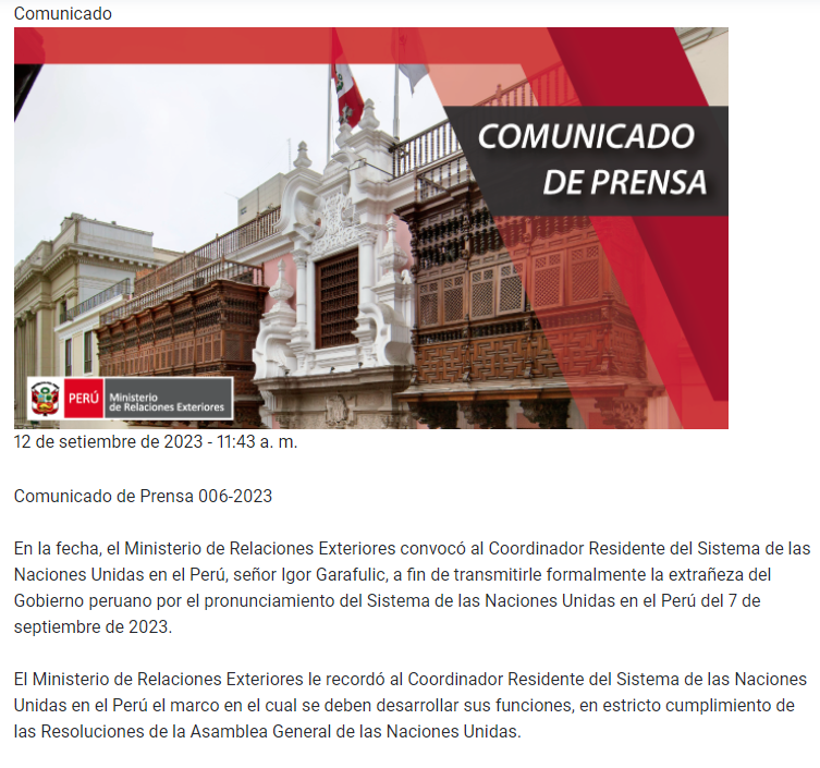 “El Ministerio de Relaciones Exteriores le recordó al Coordinador Residente del Sistema de las Naciones Unidas en el Perú, el marco en el cual se deben desarrollar sus funciones, en estricto cumplimiento de las Resoluciones de la Asamblea General de las Naciones Unidas”, se lee en el comunicado.