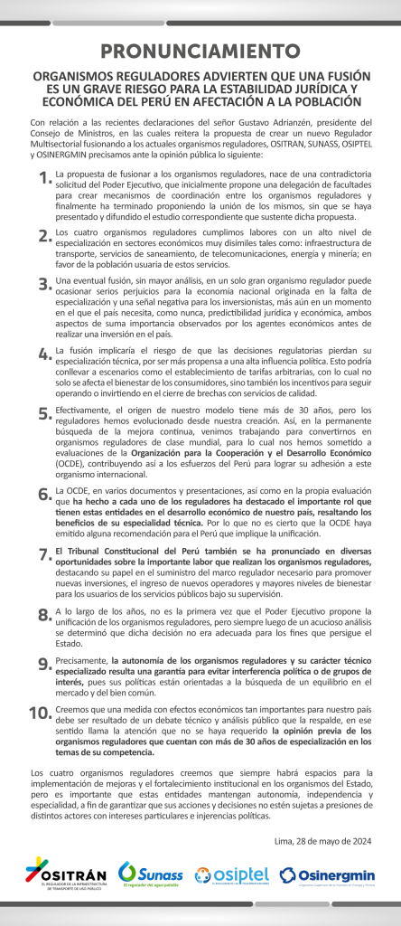 A través de un comunicado en conjunto por parte de estas entidades reguladoras, indicaron que desde el Ejecutivo hay una “contradicción” porque inicialmente en la solicitud de delegación de facultades que sustentaron ante la Comisión de Constitución del Congreso el último martes 28 de mayo, plantearon crear mecanismos de coordinación entre estas instituciones, pero al final desean unirlas sin que se halla un estudio de dicha propuesta.