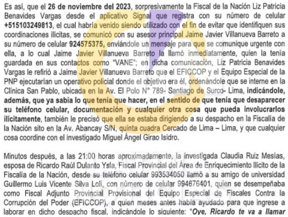 “Sorpresivamente, la fiscal de la Nación, Liz Patricia Benavides Vargas, se comunicó con su asesor principal, Jaime Villanueva, ordenándole que se interne en la clínica San Pablo e indicándole que es lo que tenía que hacer. En el sentido que tenía que desaparecer su teléfono celular, documentación y cualquier cosa que pueda involucrarlos ilícitamente. También le precisó que ella se dirigía a su despacho y cualquier cosa coordine con el investigado Miguel Ángel Girao“, indica el documento de Eficcop.