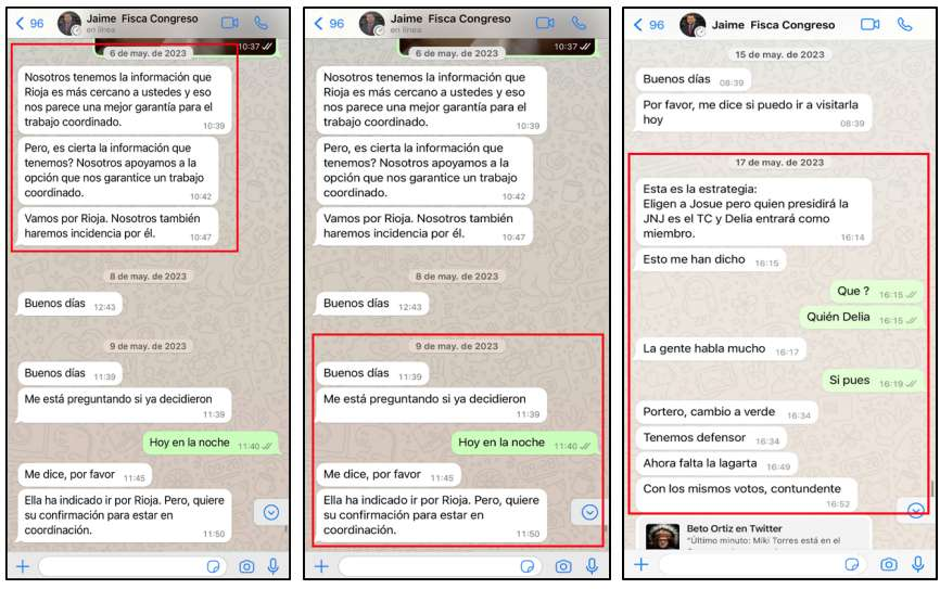 «Es en este contexto que el defensor es muy importante, pues él es quien preside la comisión que elegirá a la nueva JNJ. Si se queda la señora, que está ahora la nueva junta, también estaría tomada por los caviares. Eso es lo peligroso«, indica una de las conversaciones en Whatsapp de Jaime Villanueva.