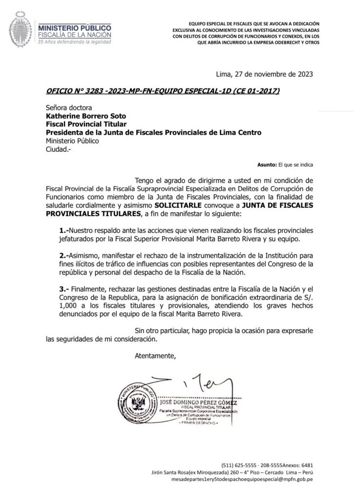 En un oficio enviado este lunes 27 de noviembre y dirigido a Katherine Borrero Soto, presidenta de fiscales de Lima Centro, José Domingo Pérez solicita la convocatoria urgente de la Junta de Fiscales Provinciales.