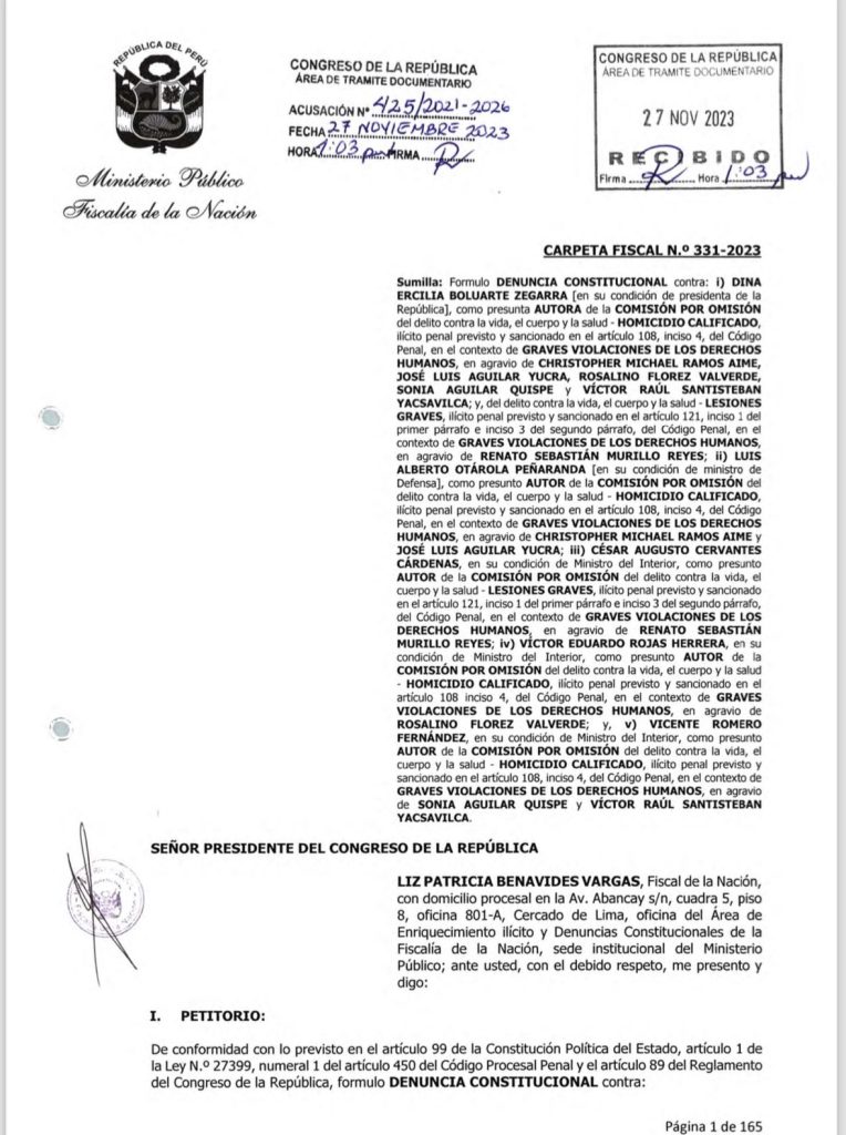 La fiscal de la Nación, Patricia Benavides, presentó una denuncia constitucional contra la presidenta Dina Boluarte y otros altos funcionarios por las muertes ocurridas durante las protestas de diciembre 2022 y enero 2023.