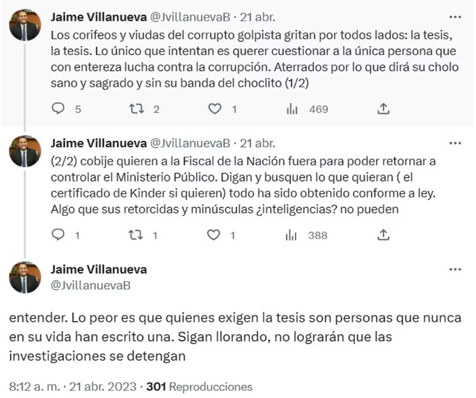 La presencia de Villanueva cobró aún más relevancia cuando apoyó la gestión de Patricia Benavides, a quien destacó como una persona que lucha contra la corrupción. Este funcionario sería quien habría gestionado para que voten a favor de la inhabilitación de Zoraida Ávalos, según denunció la exfiscal de la Nación.