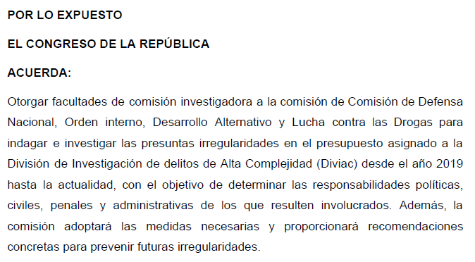 “Según el Informe de Auditoría N° 035-2024-2-3792-AC (de carácter reservado) de la Contraloría General de la República, se ha descubierto en la División de Investigación de Delitos de Alta Complejidad (DIVIAC) documentos de solicitud de recursos por S/120,395 para labores de inteligencia que fueron firmados por dos personas diferentes ocupando el mismo cargo, lo que sugiere la existencia de justificativos duplicados, conforme a una auditoría realizada en 2022”, se menciona.