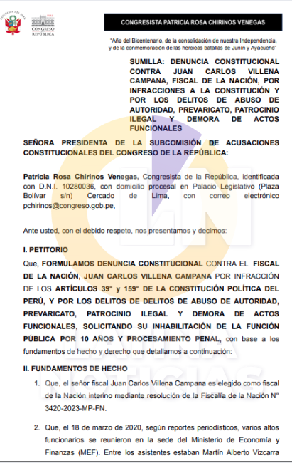 La denuncia constitucional presentada por Chirinos acusa al Fiscal de la Nación de varios delitos, incluyendo abuso de autoridad, prevaricato, patrocinio ilegal, demora de actos funcionales e infracción constitucional. En este contexto, la congresista ha solicitado la inhabilitación de Juan Carlos Villena para la función pública por un periodo de diez años.