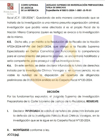 Frente a ello, el Juzgado Supremo de Investigación Preparatoria resolvió declarar infundada la solicitud de tutela de derechos instada por la defensa de Patricia Chirinos Venegas.