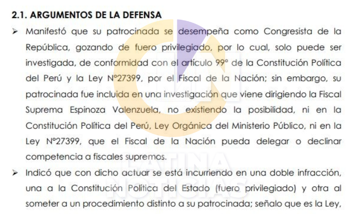 De acuerdo al expediente, Patricia Chirinos argumenta que la fiscal suprema Delia Espinoza no tiene competencia para investigar a funcionarios con la condición de “aforados”, según lo establecido en el artículo 99 de la Constitución. Sin embargo, la fiscal emitió la disposición que la incorpora a esta investigación que está bajo su cargo. Es decir, la congresista sostiene que la fiscal Espinoza no tiene la potestad para ello y que esta medida debería ser exclusiva del fiscal de la Nación.