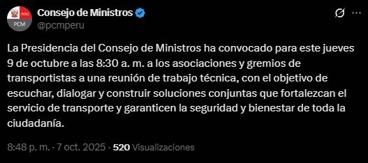 “La Presidencia del Consejo de Ministros ha convocado para este jueves 9 de octubre a las 8:30 a. m. a las asociaciones y gremios de transportistas a una reunión de trabajo técnica, con el objetivo de escuchar, dialogar y construir soluciones conjuntas que fortalezcan el servicio de transporte y garanticen la seguridad y bienestar de toda la ciudadanía“, señala la publicación.