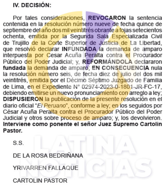 Latina Noticias accedió al documento en el que se menciona que Cartolin, en su calidad de miembro de la Sala de Derecho Constitucional y Social Permanente de la Corte Suprema de Lima, fue el ponente de la causa de Acuña Peralta. Allí es que recomendó que se revoque la sentencia emitida por la Segunda Sala Especializada Civil de Trujillo que declaró infundado el recurso de apelación del líder de APP.