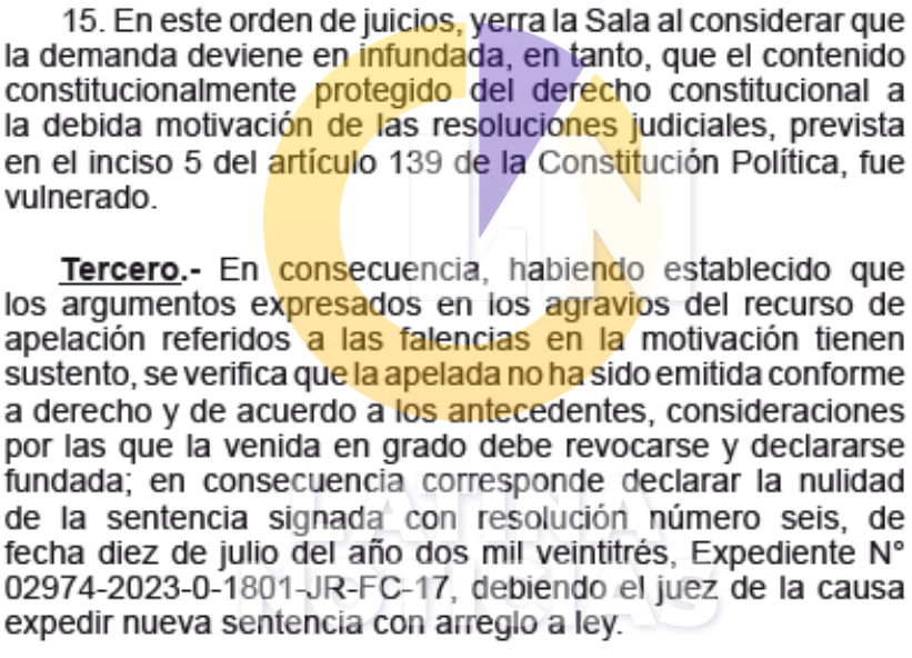 En esa línea, la Sala de Derecho Constitucional y Social Permanente de la Corte Suprema de Lima llegó a la conclusión que se vulneró el derecho constitucional de Acuña a la debida motivación de las resoluciones judiciales, por lo que se ordenó la nulidad de la sentencia que se registró en su contra.