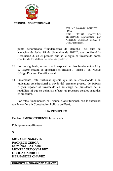 Según la resolución a la que Latina Noticias accedió, los magistrados del TC, Francisco Morales Saravia, Luz Pacheco, Helder Domínguez, Manuel Monteagudo, César Ochoa, y Pedro Hernández, no aceptaron el recurso de agravio constitucional presentado por los abogados Andrés Coello Cruz y Andrés Coello Cáceres en favor de Castillo Terrones para volver a tomar las riendas del Ejecutivo.