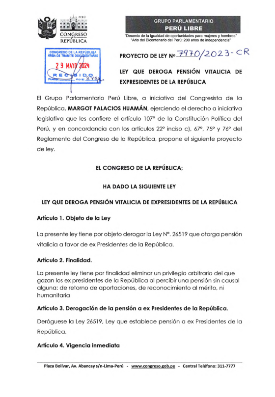 La bancada de Perú Libre presentó una iniciativa legislativa para que se le retire la pensión vitalicia a los expresidentes de la República. La promotora de la idea es la vocera de dicho partido, Margot Palacios, quien apunta a derogar la ley 26519.