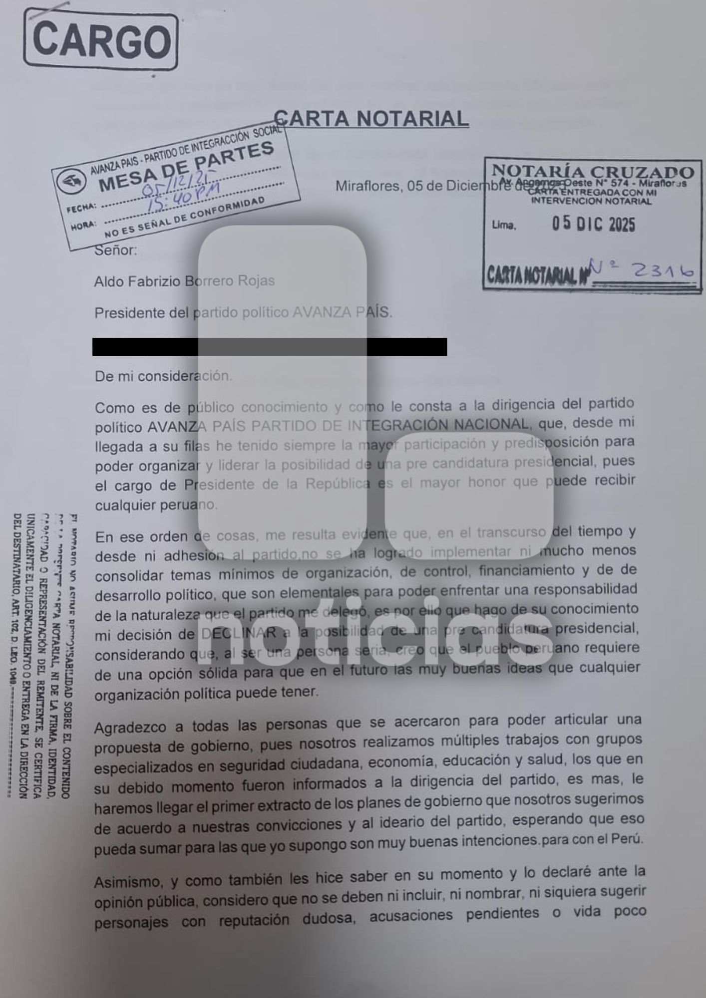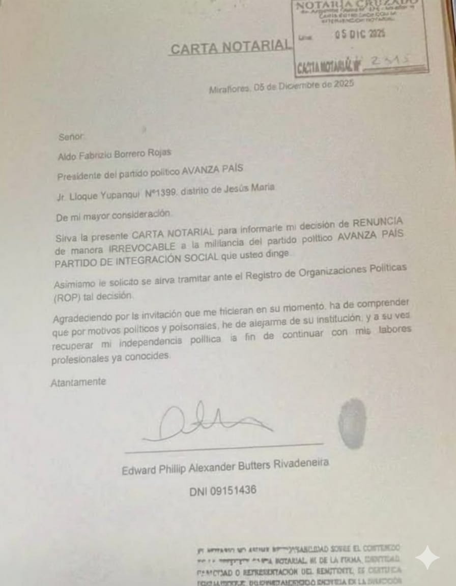 Mediante una carta notarial dirigida al presidente de Avanza País, Aldo Borrero, el también presentador de televisión señaló que su renuncia se debe a “motivos políticos y personales”, y que busca recuperar su “independencia política” con el objetivo de retomar sus labores profesionales.