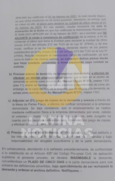 Latina Noticias accedió en exclusiva a la resolución del Décimo Juzgado Especializado en lo contencioso administrativo del PJ, con fecha del último 19 de abril, en el que le solicita al MTC a que realice las subsanaciones advertidas en un plazo de 5 días hábiles desde el momento que son notificados “bajo apercibimiento de de ser rechazada la demanda y ordenar el archivo definitivo”.