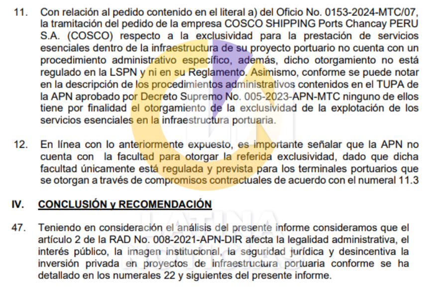 La conclusión a la que llegó la Unidad de Asesoría Jurídica de la APN es que el acuerdo que favoreció al consorcio chino peruano «afecta la legalidad administrativa, el interés público, la imagen institucional, la seguridad jurídica y desincentiva la inversión privada en proyectos de infraestructura portuaria».